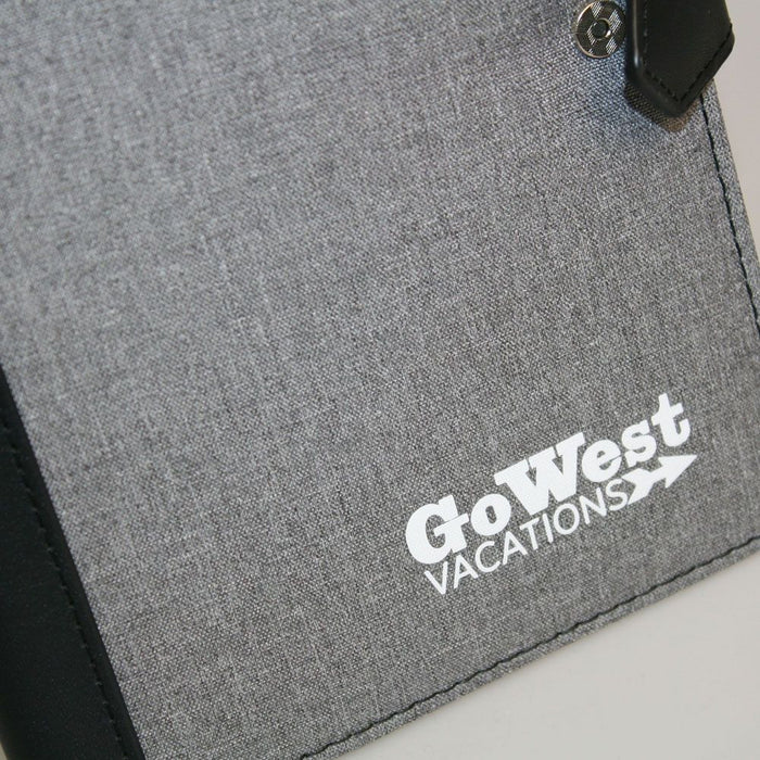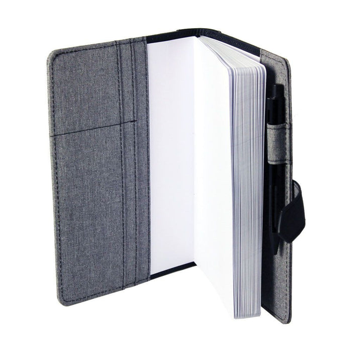 The secret behind capturing your chaotic genius? The Trekk Journal Book. This A5 marvel is your trusty sidekick, crafted from on-trend grey polyester with a rebellious black PU and nylon contrast. It's not just a journal—it's a statement. With a magnetic snap button closure, pockets for your business cards, and a pen loop, it's ready to rock your world of notes and doodles.