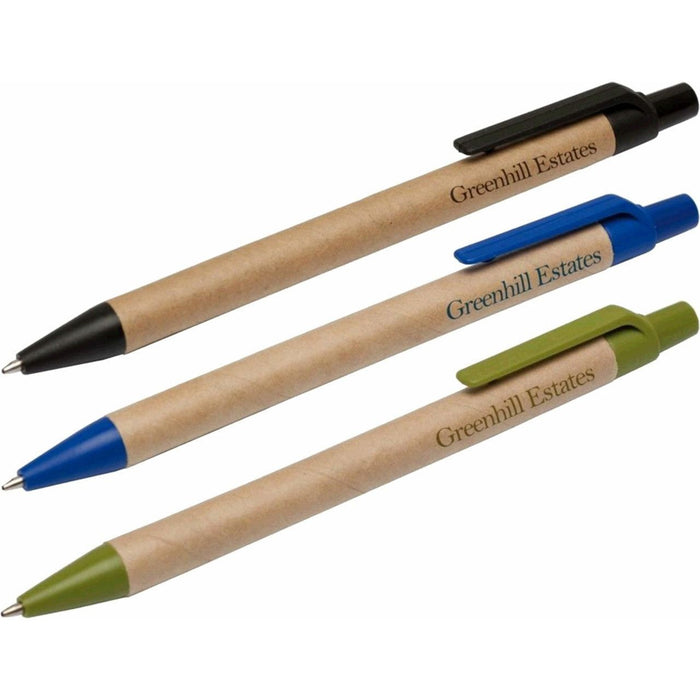 Introducing your new favourite pen with a conscience—the Eco Writer 2. This isn't just any pen; it's a statement. Crafted from recycled paper and biodegradable cornstarch fittings, it's the eco-warrior's weapon of choice. Whether you're scribbling down your next big idea or doodling in the margins, do it with a pen that cares as much about the planet as you do. Available in natural with a choice of black, blue, or green trim, it's the perfect eco-friendly giveaway that says, "I'm here to save the world, one note at a time."