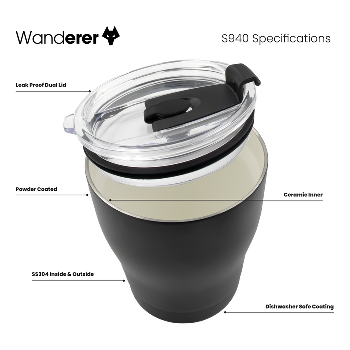 Introducing your new favourite sidekick for caffeinated capers—the Wanderer 354ml Tumbler. This isn't just a tumbler; it's a rebellious blend of practicality and style, ready to rock your world with its leak-proof lid and ceramic inner. Whether you're cruising through the outback or just surviving the daily grind, this tumbler's dual lid design and compact size make it the perfect partner in crime for your cup holder.